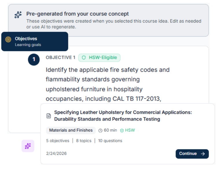 CEU Builder generates learning objectives, outlines, quizzes, and research based on your topic and source materials. You review and refine. The AI does the heavy lifting.