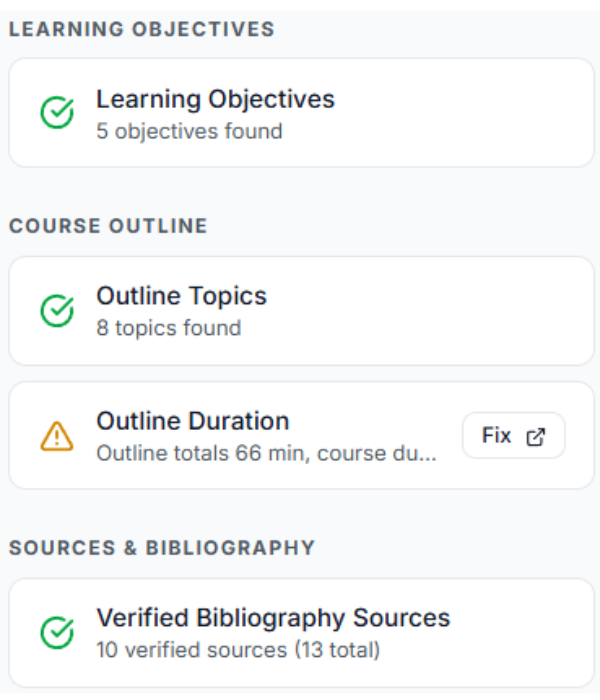 CEU Builder validates every requirement before you file. HSW content thresholds, source verification, learning objective alignment, assessment standards, and duration requirements are checked automatically. No more rejection letters.